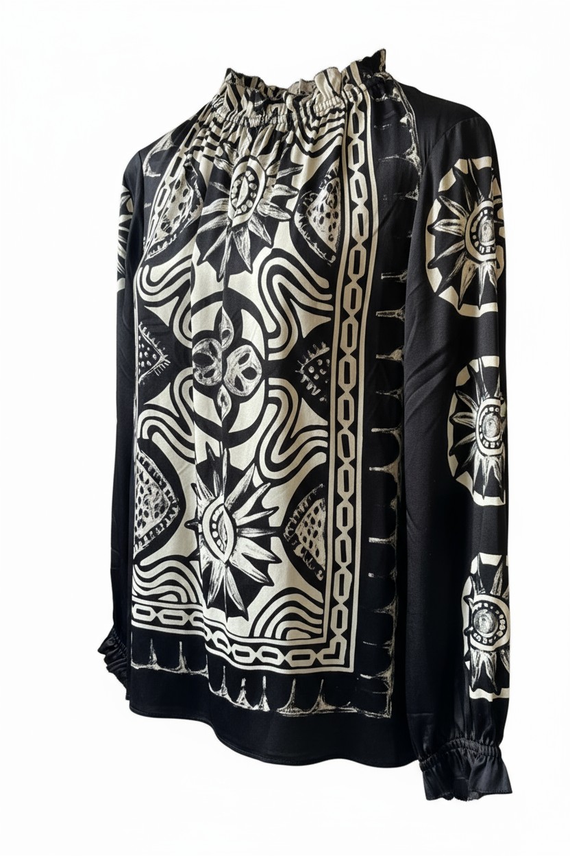 Seidenbluse von GRACE – Kunst trifft Mode Mit dieser Bluse von GRACE setzt du ein Statement: Das auffällige schwarz-weiße Ornament-Design wirkt wie ein Kunstwerk auf fließendem Stoff – edel, modern und mit ganz viel Persönlichkeit. Der hochgeschlossene, leicht geraffte Kragen und die weiten Ärmel mit Rüschenabschluss verleihen ihr einen femininen…