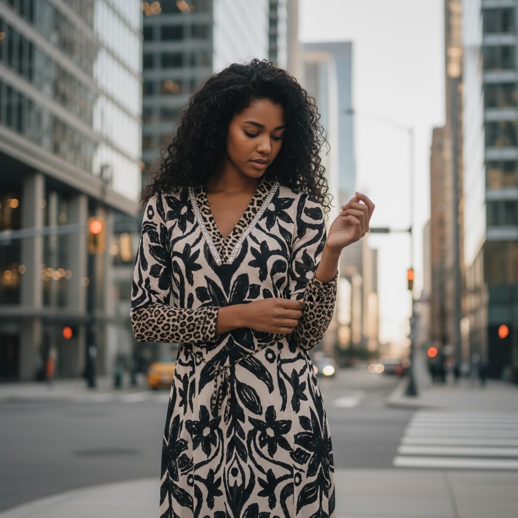 279,00 €Kleid von GRACE – Modern, elegant & wild zugleich Dieses Kleid von GRACE vereint feminine Eleganz mit einem Hauch Extravaganz! Der ausdrucksstarke schwarz-weiße Print wird durch Leopardendetails an Ausschnitt und Ärmeln, sowie dem Glitzer-Besatz am Ausschnitt perfekt ergänzt – ein echtes Statement-Piece für starke Auftritte.Der V-Ausschnitt und die taillierte Passform…