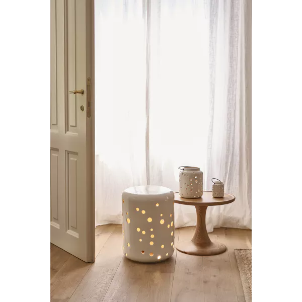 Die MIRILLA Laterne in der kleineren Grรถรe zeigt, wie viel Atmosphรคre in einem kompakten Design stecken kann. Ihre geschlossene, organische Form aus Steingut wirkt ruhig und puristisch โ doch sobald du eine Kerze hineinstellst, entfaltet sich ihr ganzer Zauber.