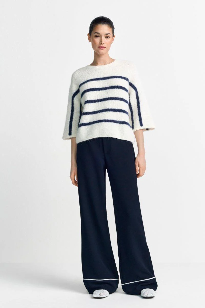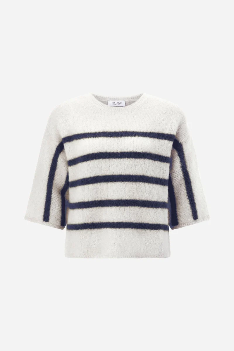 Dieser flauschige Pullover kombiniert klassisches Creme mit farbigen Streifen zu einem It-Piece für den Winter. Die weiten Ärmel, der Crewneck und die kurze Passform verleihen dem Design einen modernen Touch.